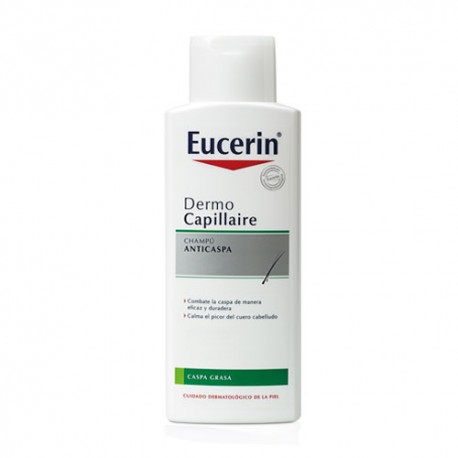 Eucerin DermoCapillaire Champú Anticaspa está diseñado específicamente para la caspa grasa y para la dermatitis seborreica. Limpia con suavidad el pelo y el cuero cabelludo, eliminando las escamas amarillas y pegajosas, a la vez que reduce de manera efectiva la caspa grasa y la mantiene bajo control. Su suave fórmula calma el cuero cabelludo y reduce el picor desde el primer lavado, mientras que sus agentes de acondicionamiento especial proporcionan un pelo con brillo sano y una sensación de suavidad.